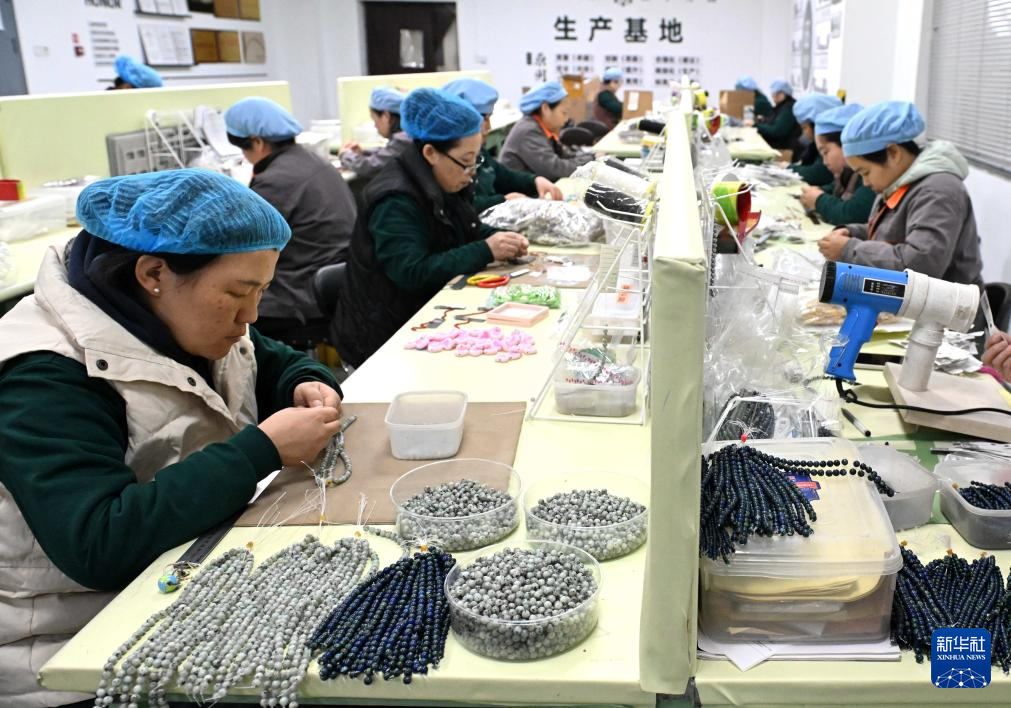 12月22日,在河北省石家庄市一家珠宝产品创意企业,工作人员在制作项链。